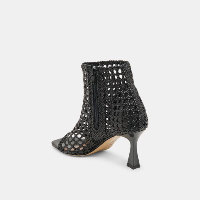 Product details Made in Italy, made to stand out. This is QUIN. This tapered heel bootie is crafted with woven leather and features an open toe for a light and airy feel. Available in essential bone or black leather, QUIN is the transition boot your wardrobe is calling for this season. Leather Upper Leather Outsole Leather Lining Leather Sock 3.9″ Shaft Height 4.3″ Leg Circumference 2.8″ Heel Height Made in Italy