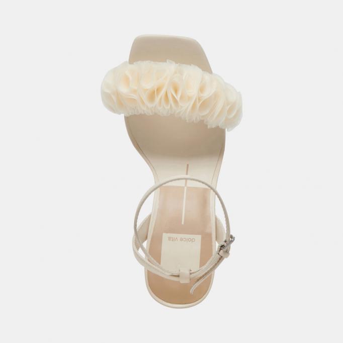 Product details IESHA is unapologetically feminine. Her block heel and minimal ankle strap is finished off with ruffle detailing for a statement heel that just so happens to be made with recycled materials. Leather + Textile Upper Recycled Synthetic Outsole Water-based Leather Alternative Lining + Sock 3.2” Heel Height Imported