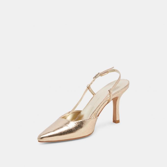 Product details KIM is a lesson in sleek sophistication. Understated and chic details abound—a pointed toe, slingback strap, and stiletto heel in choices that range from statement metallics to quietly luxe suede. Leather Upper Rubber Outsole Synthetic Lining + Sock 3.4″ Heel Height Imported