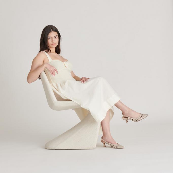 Product details OLYMPA has that timeless vintage look. This sling-back with a kitten heel features an all over braided design in white, black, or gold metallic.